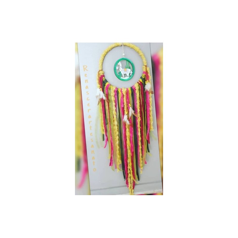 Caçador de Sonhos com cavalinho em madeira, fitas e penas