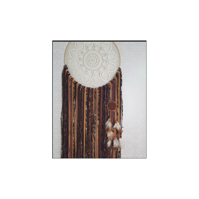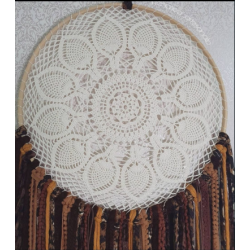 Filtro de sonhos em crochet com fitas rendas e penas