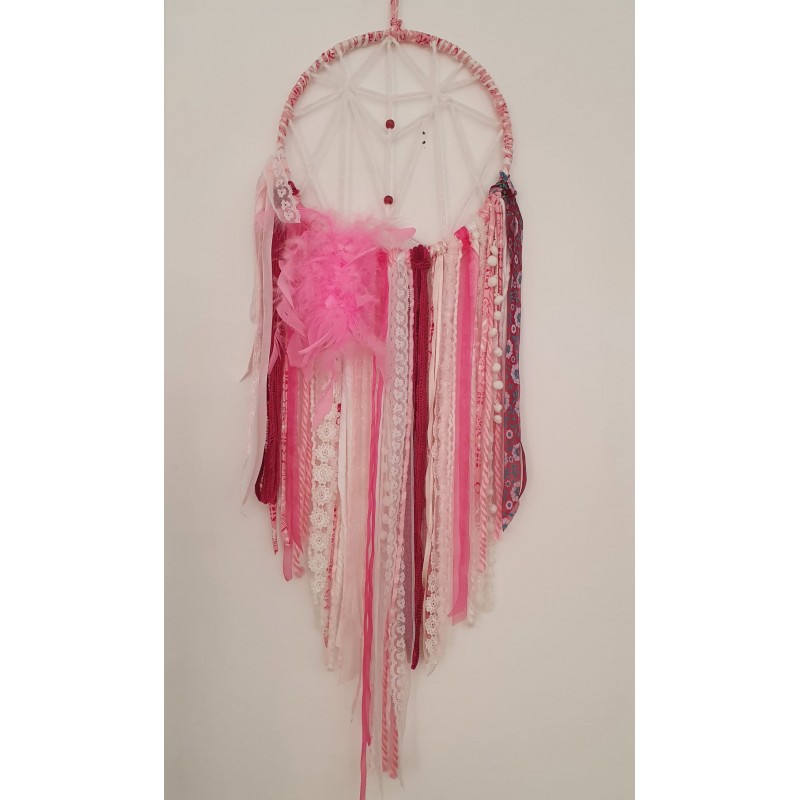 Caçador de sonhos rosa feita em rede com fitas, rendas e plumas